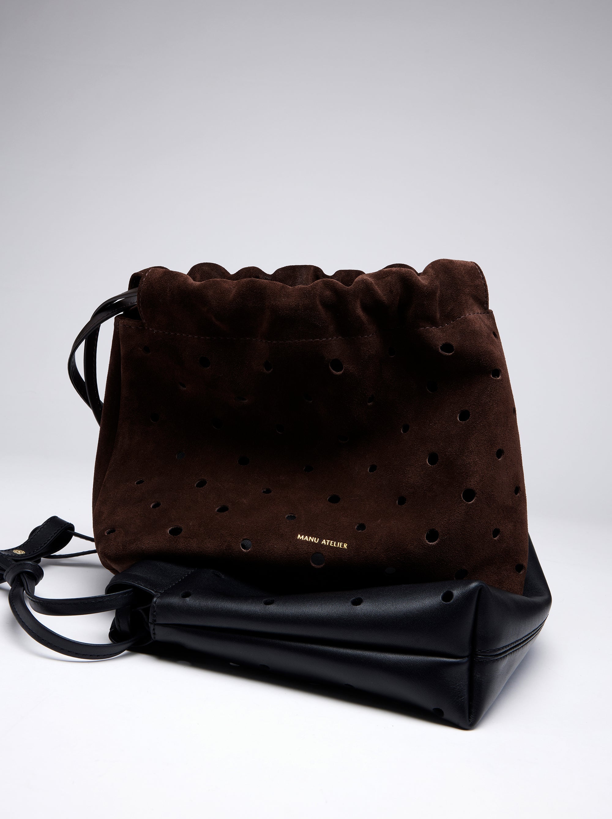 Softly structured yet playfully undone, the Romy Pouch introduces Manu Atelier’s modern approach to craftsmanship. Made with a perforated design, a full leather interior, and a suede leather exterior, it highlights the beauty of pure material and meticulous construction. The drawstring design gathers the leather into gentle, sculptural folds, creating a sense of natural movement and effortless refinement. Designed with versatility in mind, its slender, bitter brown calf leather strap can be detached, transforming the Romy into a sleek and effortless clutch.