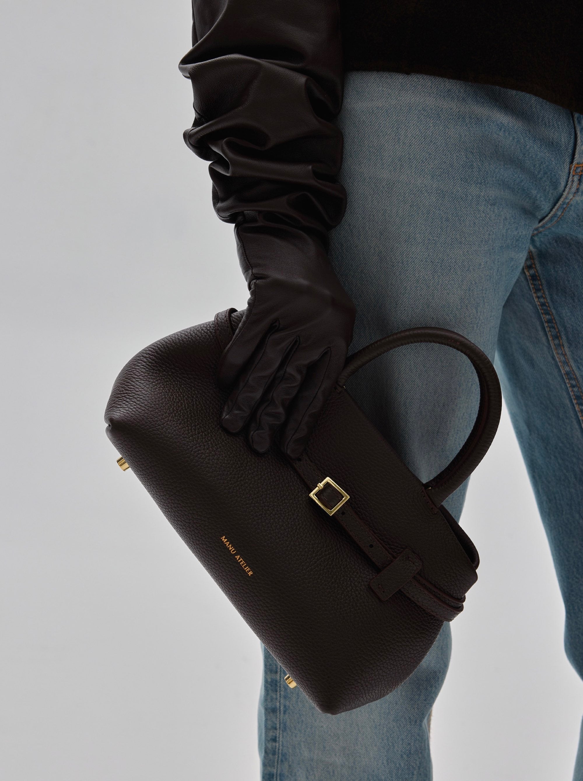 Perfect for busy days and elegant evenings, the Manu Atelier Le Cambon 25 Deep Brown features rich calf leather, a structured shape, and adaptable top handles plus a removable strap. With interior beige lining and an embossed zipped pocket, it achieves practical organization and minimalist beauty.