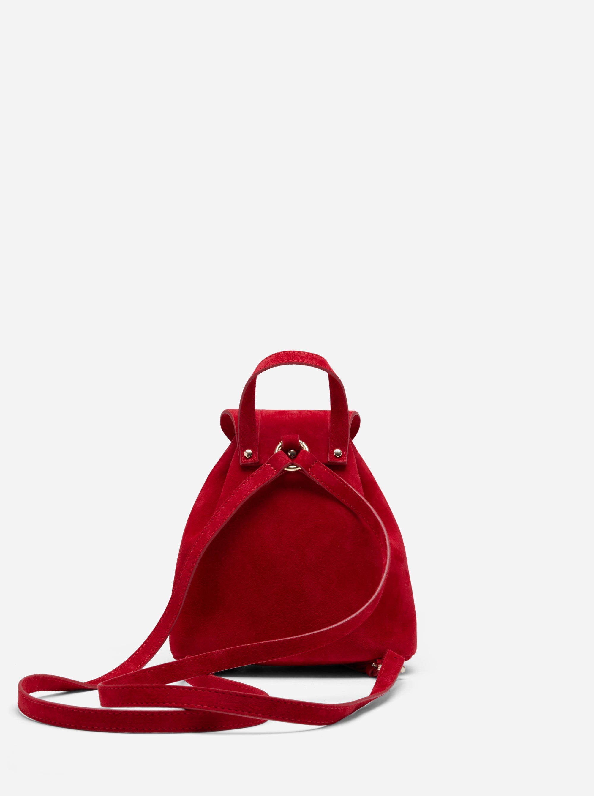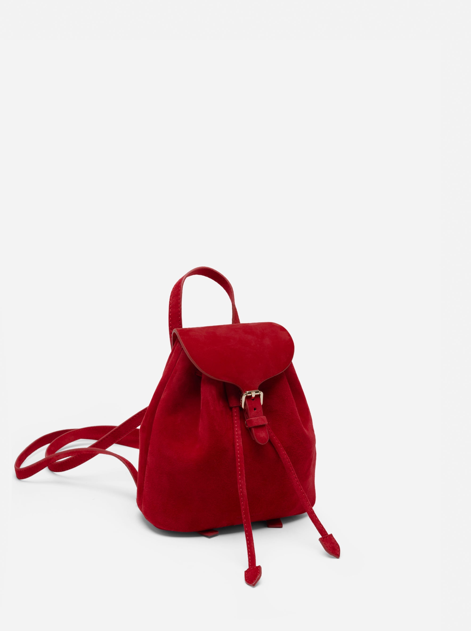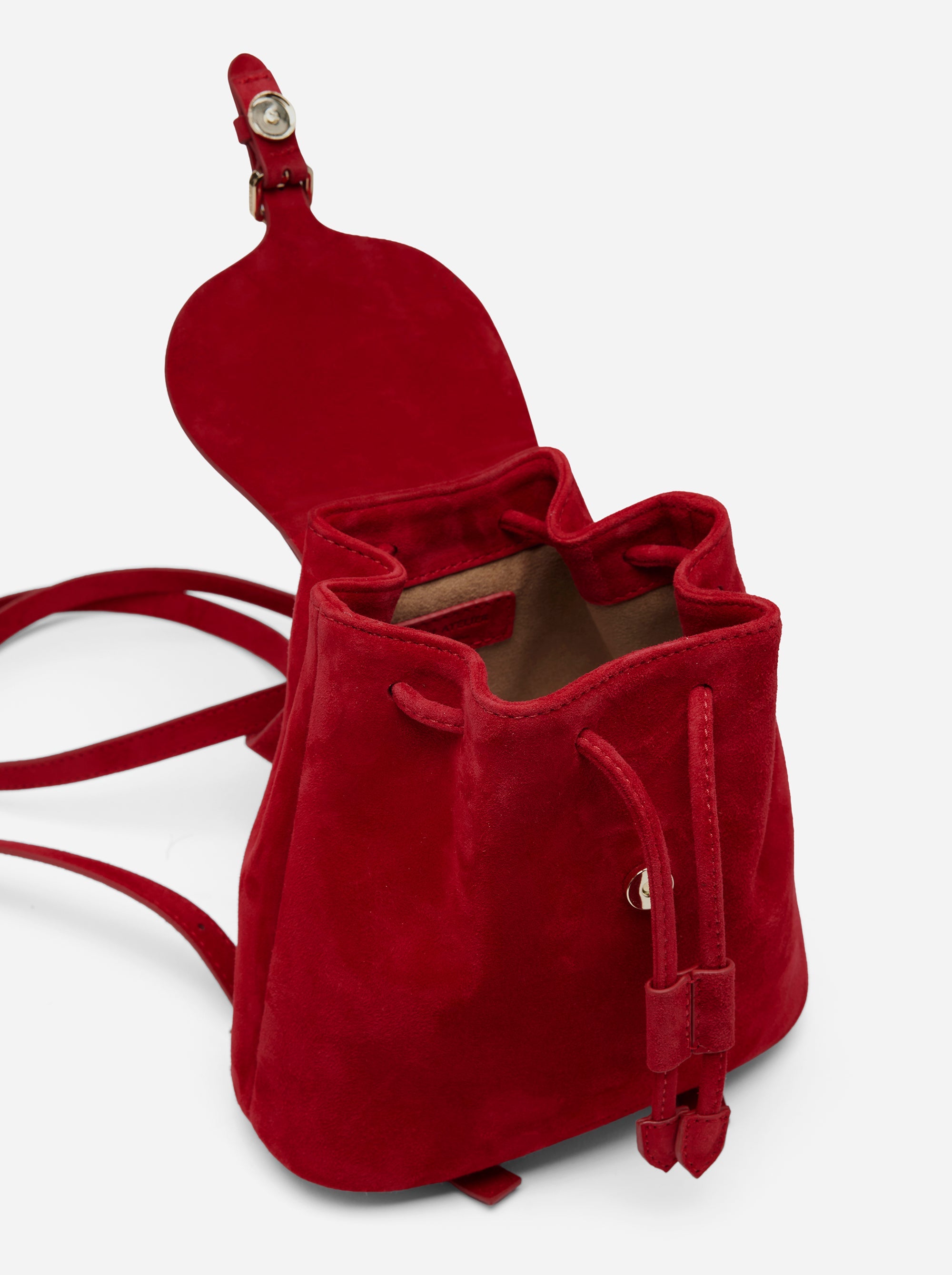 Drawstring top with a self-leather slider; finished with a buckle-fastened flap and a magnetic closure